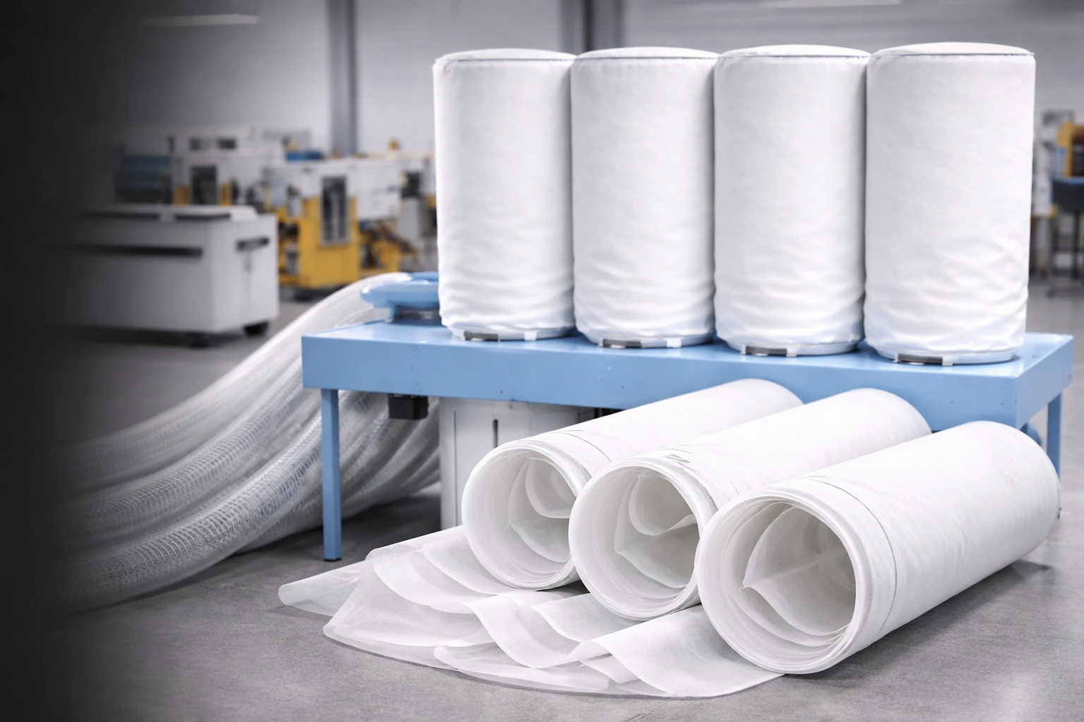 Установили 12 верхних мешков-фильтров из полиэстера с антистатической обработкой и 8 нижних пылесборников увеличенного объёма — типовое решение для деревообрабатывающей аспирации.